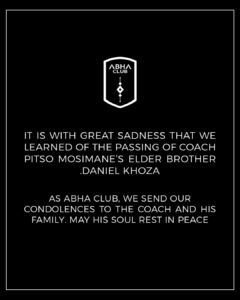 “IT IS WITH GREAT SADNESS THAT WE LEARNED OF THE PASSING OF COACH PITSO MOSIMANE’S ELDER BROTHER DANIEL KHOZA AS ABHA CLUB, WE SEND OUR CONDOLENCES TO THE COACH AND HIS FAMILY. MAY HIS SOUL REST IN PEACE”